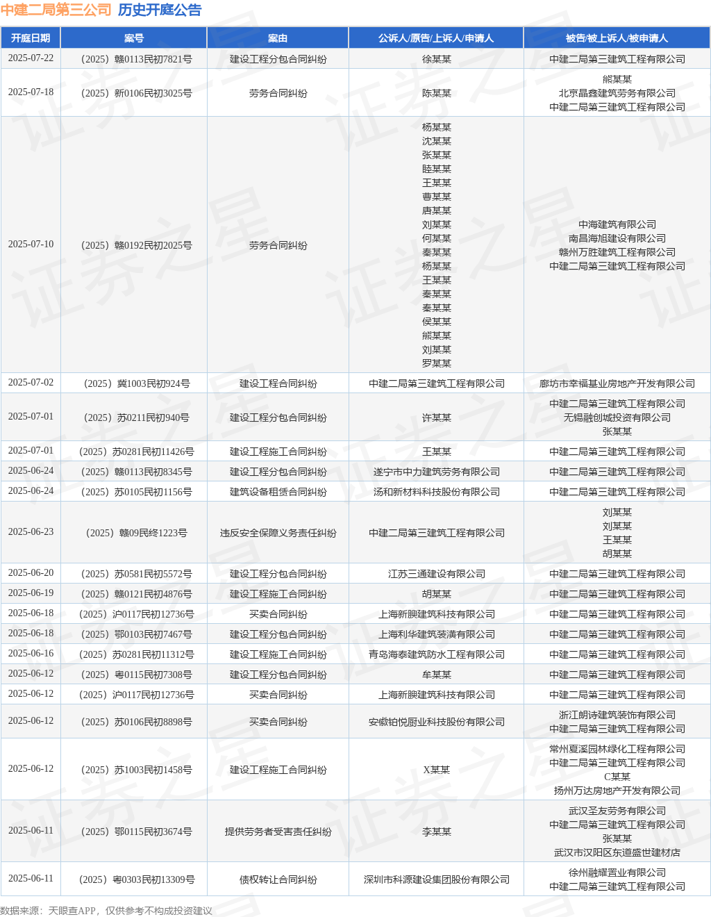 案号:(2025)苏0581民初5572号审理法院:常熟市人民法院案由:建设工程分包合同纠纷当事人信息: 原告/上诉人:江苏三通建设有限公司 被告/被上诉人:中建二局第三建筑工程有限公司开庭日期:2025年6月20日根据统计,近一年内以中建二局第三建筑工程有限公司为当事人的历史开庭公告有587则,其中案由为“买卖合同纠纷”的公告以197则居首,其次为“建设工程施工合同纠纷”有78则,“建设工程分包合同纠纷”有78则。历史开庭公告(前20条)如下: